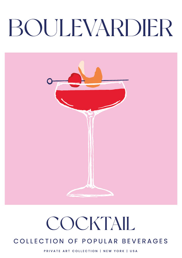 Con una presencia intensa y una composición equilibrada, el Boulevardier se presenta como un icono de elegancia clásica reinterpretada. Esta ilustración captura el carácter profundo y refinado del cóctel, donde cada detalle suma personalidad.