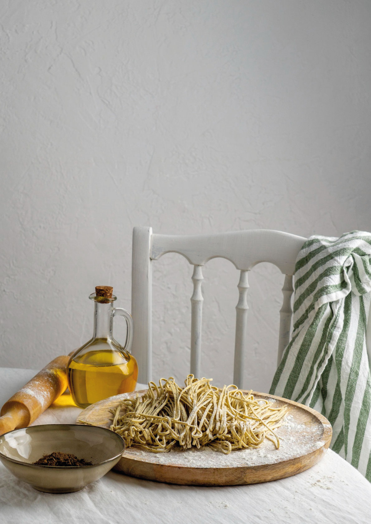 En una escena tranquila y doméstica, la pasta recién preparada descansa entre ingredientes sencillos y familiares. Domingo en casa evoca los momentos pausados, las manos enharinadas y el placer de cocinar sin prisa.
