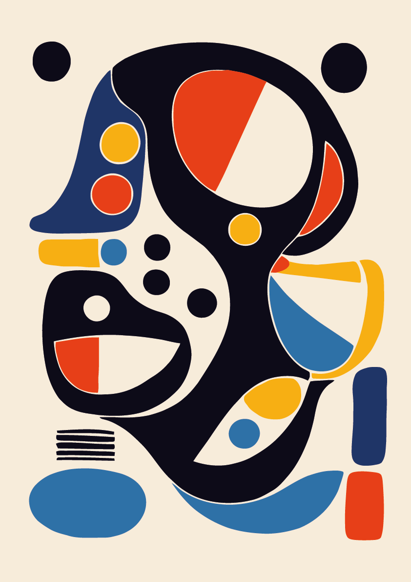 La paleta vibrante, equilibrada entre tonos cálidos y profundos, aporta dinamismo y carácter a la obra, mientras que la disposición fluida de los elementos genera una sensación de movimiento continuo. La ilustración transmite curiosidad, presencia y un diálogo constante entre forma y color.