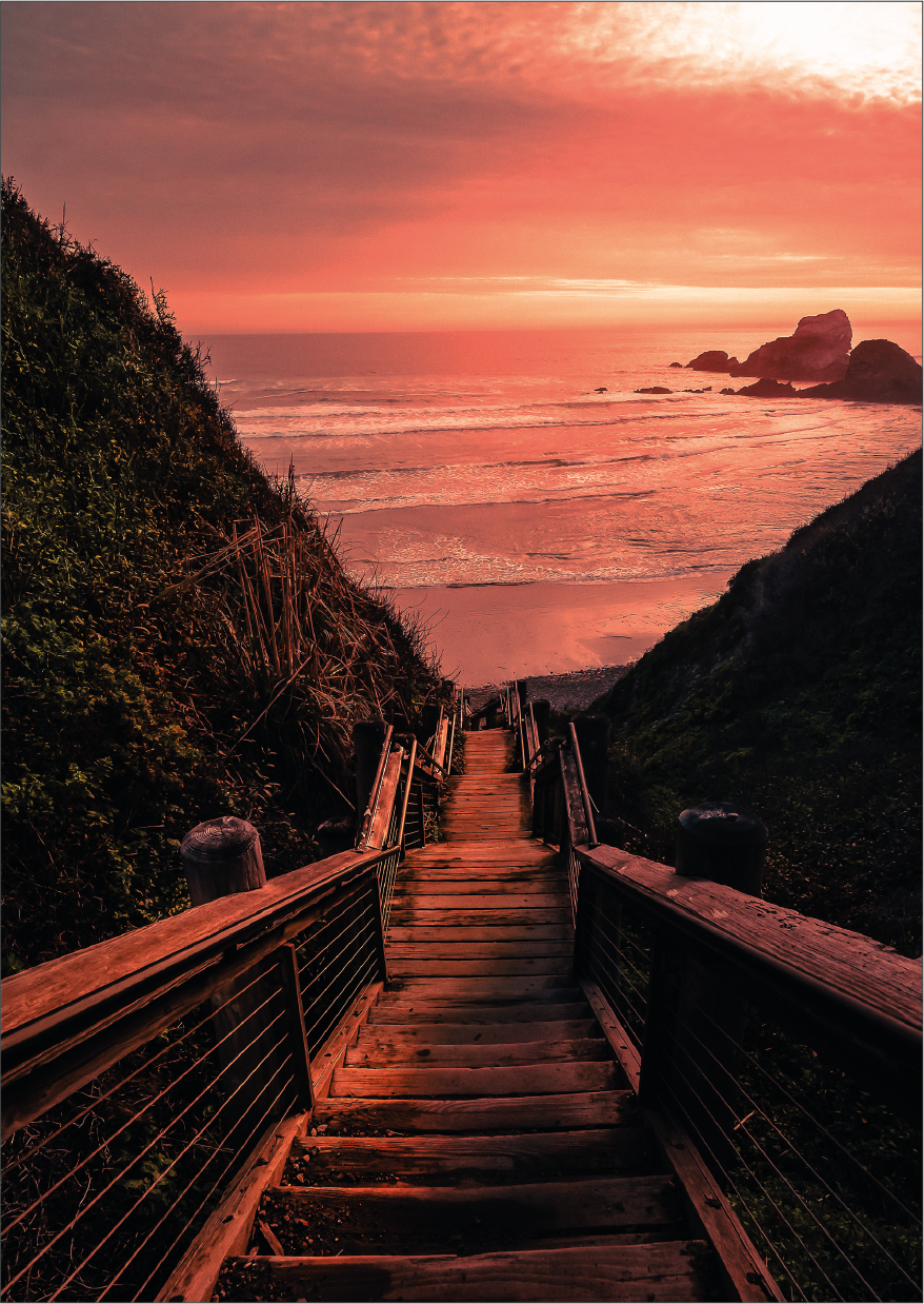 Un sendero que desciende hacia el mar mientras el cielo se tiñe de tonos cálidos. Hacia el Horizonte representa la serenidad del atardecer y la sensación de avanzar sin prisa hacia lo desconocido.