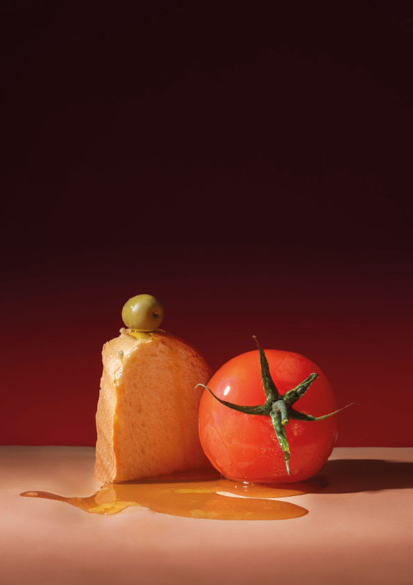 En un delicado juego de contrastes, el rojo intenso del tomate y los tonos dorados del pan se encuentran en una escena sencilla y poderosa. Rojo y Oro celebra la fuerza visual de los ingredientes esenciales.