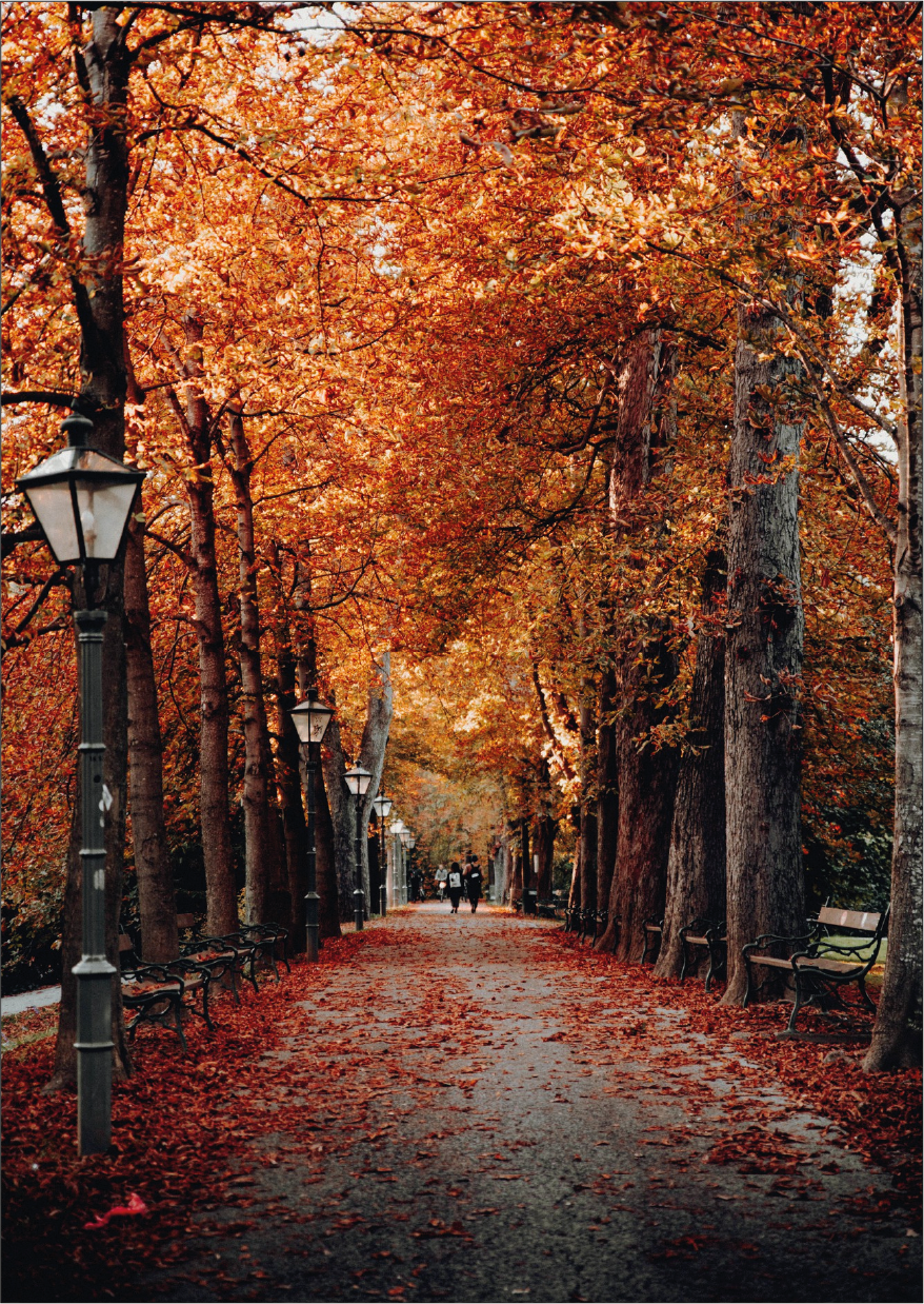 Un sendero cubierto de hojas rojas y doradas, farolas encendidas y el susurro del viento entre los árboles. Tarde de Octubre captura la esencia del otoño: serenidad, belleza y una nostalgia acogedora.