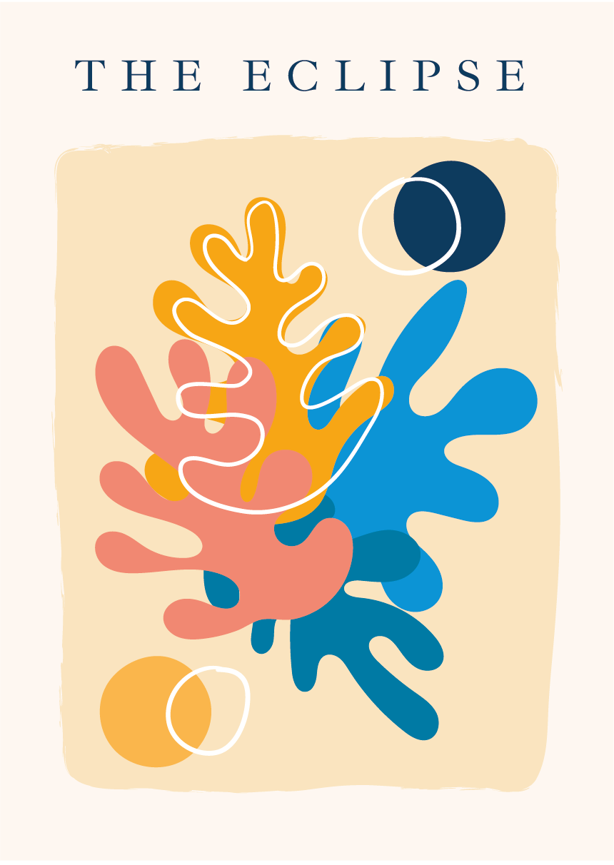 “The Eclipse” es una ilustración digital que combina formas orgánicas superpuestas y círculos simbólicos para crear una composición vibrante, dinámica y llena de energía. Los tonos cálidos y fríos —amarillos, corales y azules profundos— se entrelazan en un juego visual que evoca movimiento, luz y contraste, como si cada forma dialogara con la otra dentro de un pequeño universo abstracto. La presencia de los círculos solapados sugiere el instante poético del eclipse, aportando un toque celestial y equilibrado a la escena.