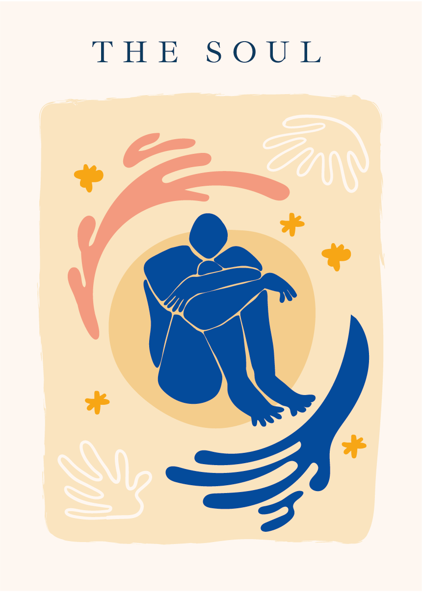 “The Soul” es una ilustración digital que representa una figura humana recogida sobre sí misma, rodeada de formas orgánicas en tonos cálidos y azules profundos que evocan protección, introspección y conexión emocional. Los trazos suaves, las curvas envolventes y las manos estilizadas que rodean la escena crean una sensación de acompañamiento simbólico, como si la figura se encontrara en un espacio íntimo donde el alma puede descansar y expresarse libremente. La composición transmite calma, sensibilidad y una estética moderna profundamente evocadora.