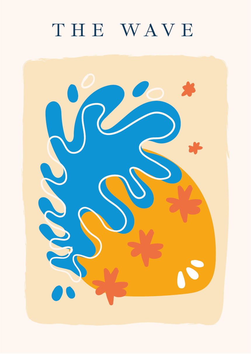 “The Wave” es una ilustración digital que combina formas fluidas y colores vibrantes para representar una ola abstracta llena de energía y movimiento. Los tonos azul intenso y naranja cálido se equilibran en una composición dinámica que evoca frescura, vitalidad y un espíritu libre. Las líneas curvas y los detalles orgánicos aportan un carácter lúdico y expresivo, creando una pieza moderna y visualmente llamativa.